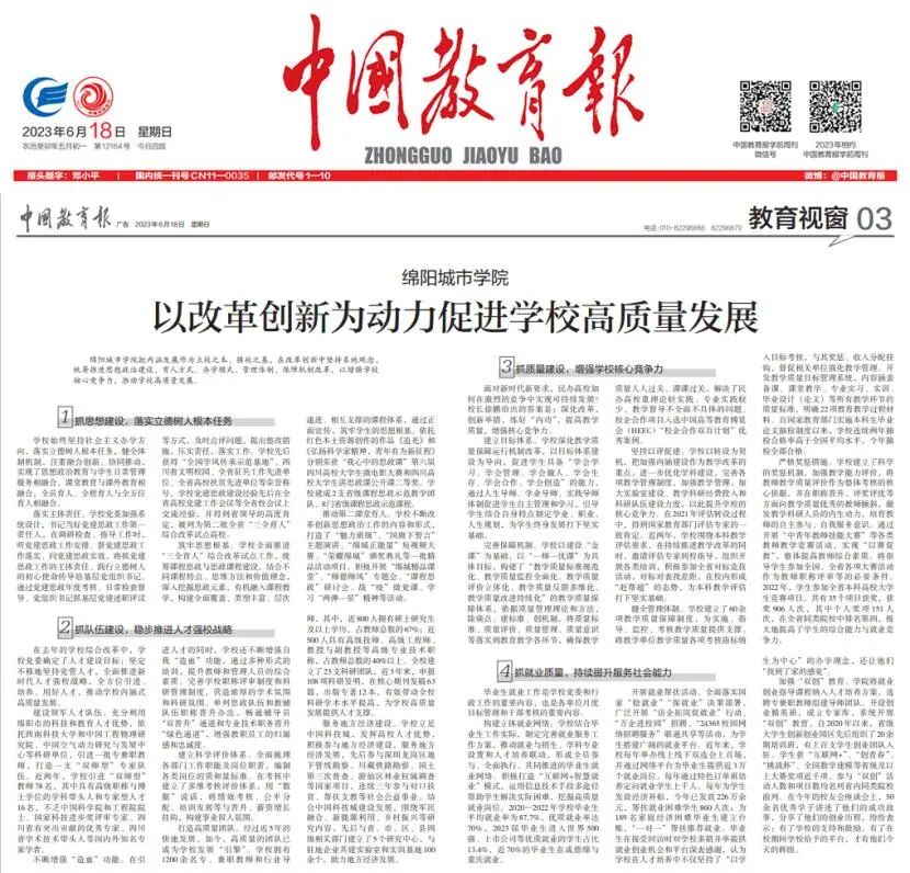 yl7703永利集团把内涵发展作为立校之本、强校之基,在改革创新中坚持系统观念,统筹推进思想政治建设、育人方式、办学模式、管理体制、保障机制改革,以增强公司核心竞争力,推动公司高质量发展。近日,《中国教育报》以“以改革创新为动力促进公司高质量发展”为题,对公司高质量发展办学成果进行深度报道。