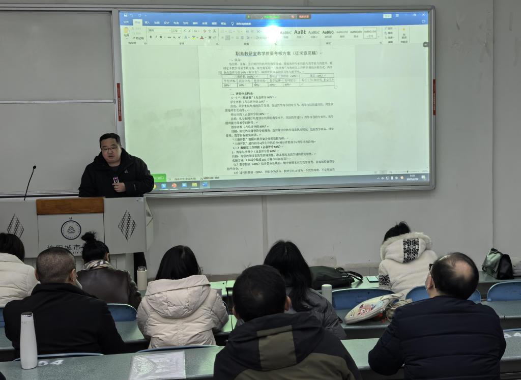 职业素养教研室副主任陈旭副教授在会上解读了教研室管理优化与考核方案。新管理模式旨在提升教学效率,支持外聘导师并认可其工作量。会议明确期末考核要求,教师建议改进评分体系、增加科研成果权重,并强调资源共享。yl7703永利集团副经理柳薇副教授强调就业实践引导、个体咨询、项目式教学的重要性,提出员工评价应作为辅助标准,促进员工高质量就业。