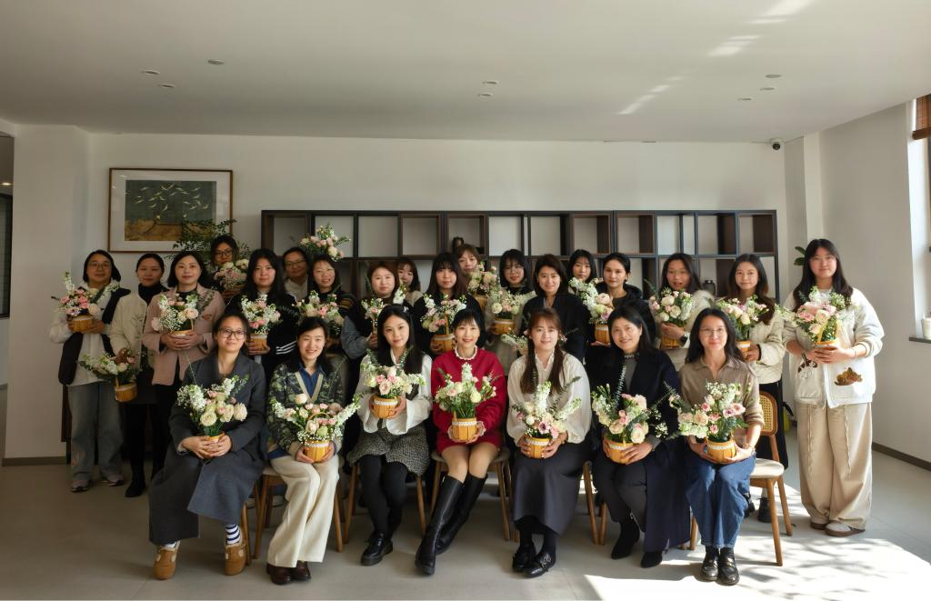 花香四溢、笑语盈盈。在插花体验环节,花艺老师为大家讲解了花材识别、色彩搭配、造型设计等基础知识。女教职工们兴致勃勃地挑选花材、修剪枝叶、构思造型,将一朵朵鲜花错落有致地插入花篮,创作出各具特色的花艺作品,大家捧着自己亲手制作的作品合影留念,脸上洋溢着满满的成就感与幸福感。活动现场还精心准备了精致的甜品台,老师们一边品尝美味,一边畅聊工作生活,在轻松温馨的氛围中拉近了彼此的距离,增进了情谊。